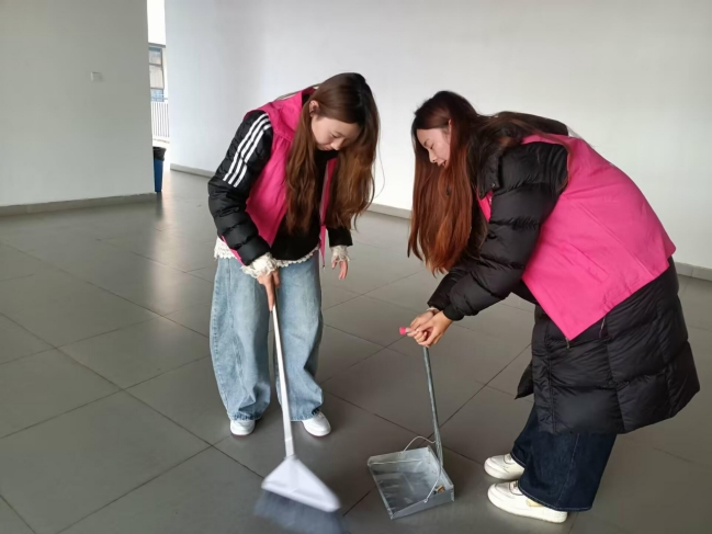 在活动过程中,志愿者们展现了高度的组织纪律性与积极的劳动热情。他们手持扫帚、拖把、抹布等工具,对教学楼的公共走廊地面、楼梯踏步进行了彻底清扫;对楼梯扶手、门窗玻璃、墙面瓷砖及公共区域的宣传栏等设施进行了认真擦拭;并重点对部分教室的讲台、多媒体控制台、课桌抽屉及黑板槽等卫生死角进行了深度清洁。同学们相互配合,协作高效,将劳动教育的内涵融入每一个细致的动作之中,充分体现了外院学子踏实肯干、团结协作的优良作风。