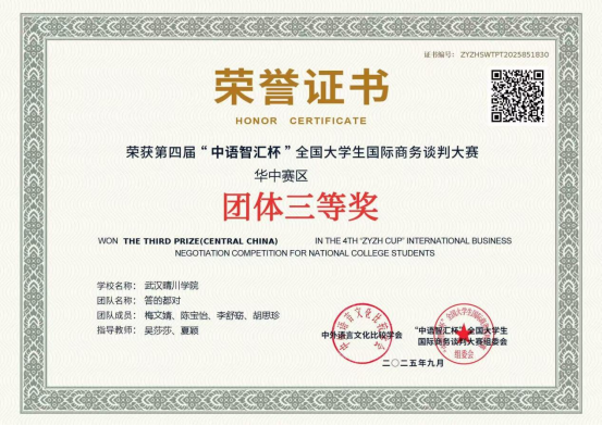 在本次比赛中,bevictor伟德官网的学子们沉着应战,凭借扎实的专业基础、清晰的谈判思路和流畅的英文表达能力,获得了评委们的认可。由王德琳、周欢、刘畅、陈盈盈组成的“Gentlee Team”团队获得华中赛区二等奖,由周诗文、王琼、李燕、杜乐同学组成的“Horizon Group”团队和由梅文婧、陈宝怡、李舒窈、胡思珍组成的“答的都对”团队获得华中赛区三等奖。其中,“Gentlee Team”代表队凭借出色的综合表现,成功晋级全国总决赛,获得了与其他赛区优秀团队同台竞技的宝贵机会。   (通讯员:周欢  柯可)