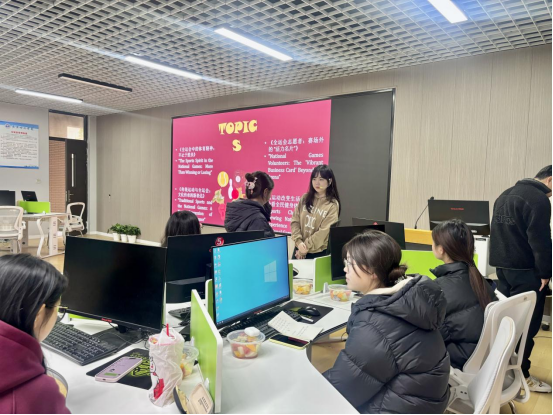 活动伊始,黄欣老师率先进行自我介绍,并为同学们讲述了自己的工作与志愿服务经历,这快速拉近了与同学们的距离。随后,黄老师邀请在场同学依次用英文自我介绍,大家踊跃发言,现场逐渐活跃起来。之后进入互动环节,黄欣老师带领同学们开展单词接龙,以“volleyball(排球)”为起始词,同学们依次接出“table tennis(乒乓球)”“rugby(橄榄球)”“cycling(骑行)”等词汇并进行英文阐释,黄老师还补充了“marathon(马拉松)”“skating(滑冰)”等相关词汇,扩展了同学们在运动方面的词汇量,同学们的关系也迅速升温。