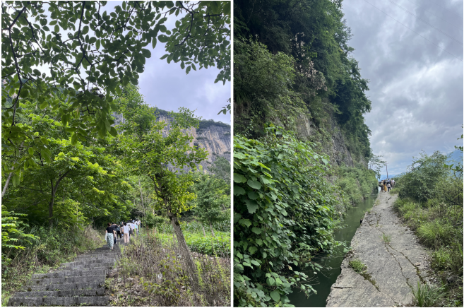 紧接着,党支部成员们带着对历史的敬畏和对英雄的敬仰,跟随谭祖顺老人的脚步,踏上了实地考察“绝壁天河”的征程。行走在蜿蜒曲折的渠边小道上,大家不时抬头仰望那镶嵌在峭壁之上的渠体,心中不禁涌起阵阵敬佩之情。沿途,谭老不时停下脚步,为大家指点当年施工的痕迹,讲述那些鲜为人知的故事。每一步前行,都是对革命先辈艰苦奋斗精神的深刻体会;每一声讲解,都是对党员同志们心灵的一次触动和洗礼。